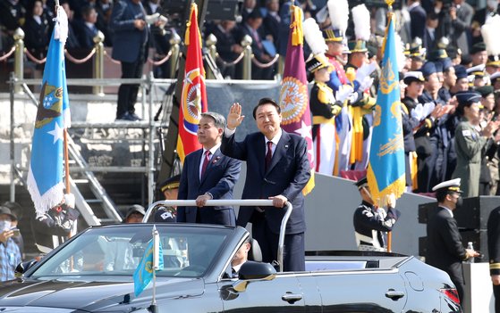 윤석열 대통령이 1일 충남 계룡대에서 열린 건군 제74주년 국군의 날 기념식에서 사열하고 있다. 뉴시스