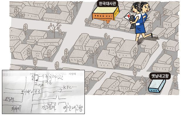 한국대사관 가는 길은… - 우즈베키스탄 수도 타슈겐트의 북한 식당 ‘내고향’ 종업원 A씨가 현지 한국 교민 B씨로부터 전달받은 약도(왼쪽 작은 사진)를 바탕으로 만든 일러스트. 약도에 표시된 ‘옛날내고향’은 2021년 식당을 옮기기 전 식당 위치를 의미한다.