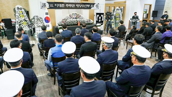 서해상에서 북한군에 피살된 고(故) 이대준 주무관의 영결식이 지난달 22일 오전 전남 목포 한 장례식장에서 해양수산부장(葬)으로 엄수되고 있다. 연합뉴스