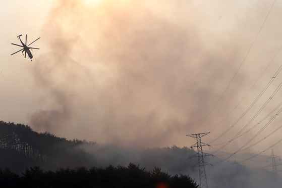 지난 3월 8일 강원도 동해시 백복령 아래에서 산림청 진화 헬기가 산불 진화작업을 벌이고 있다. [연합뉴스]
