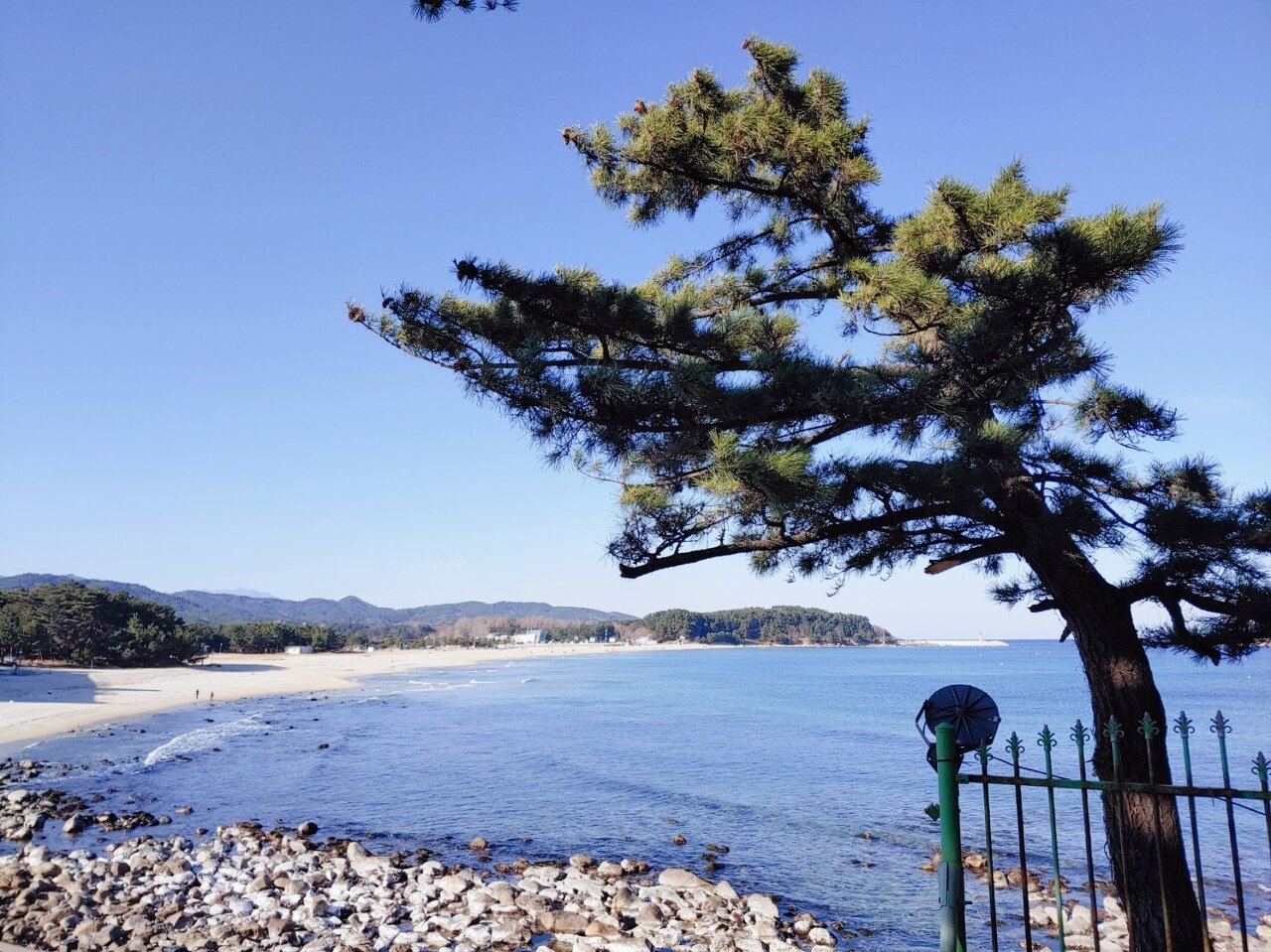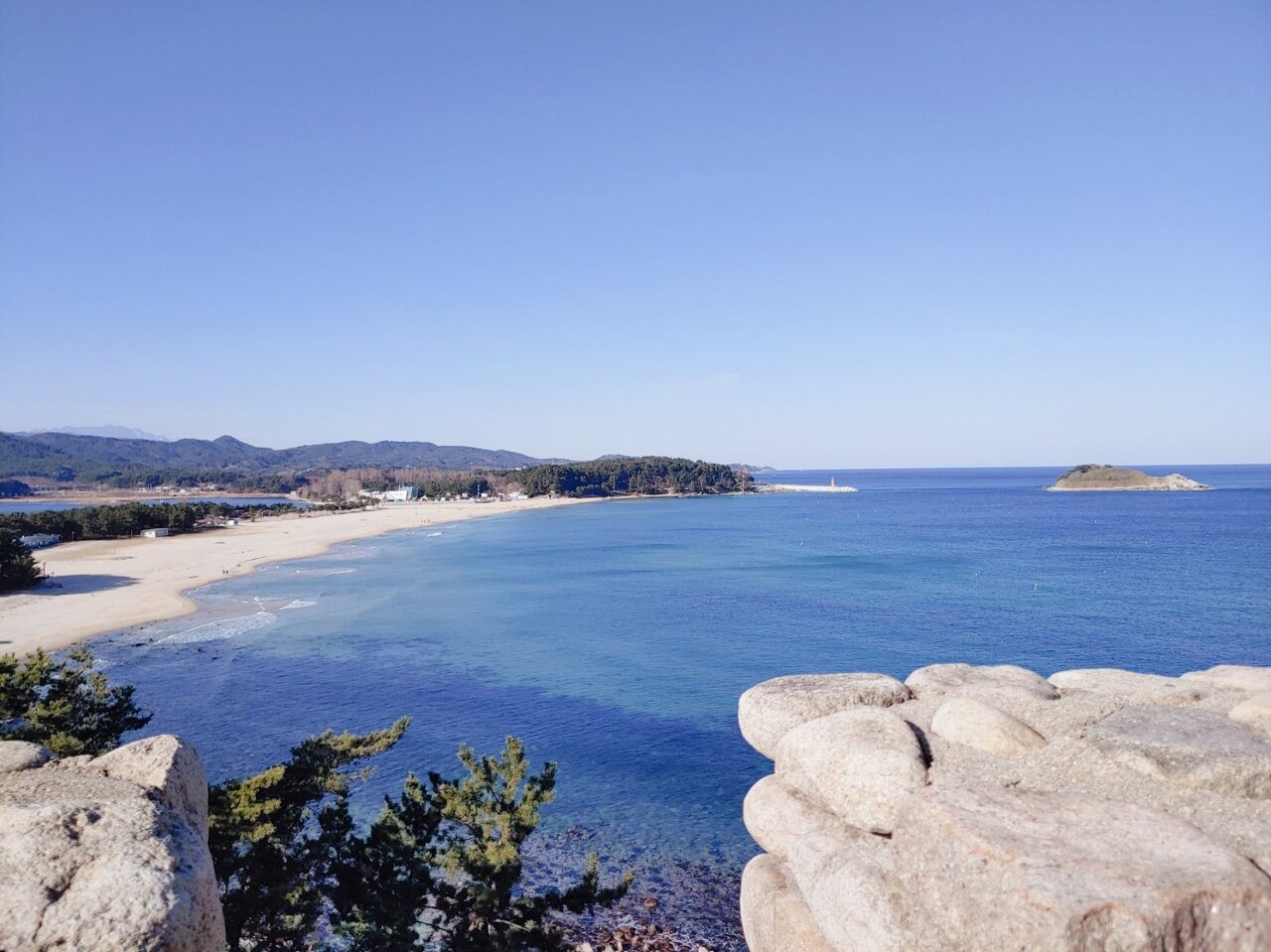 일명 명사십리라는 모래사장을 고성도 갖고 있다.오른쪽으로 보이는 작은 섬은 광개토왕 전설이 있는 거북섬,금구도이다.