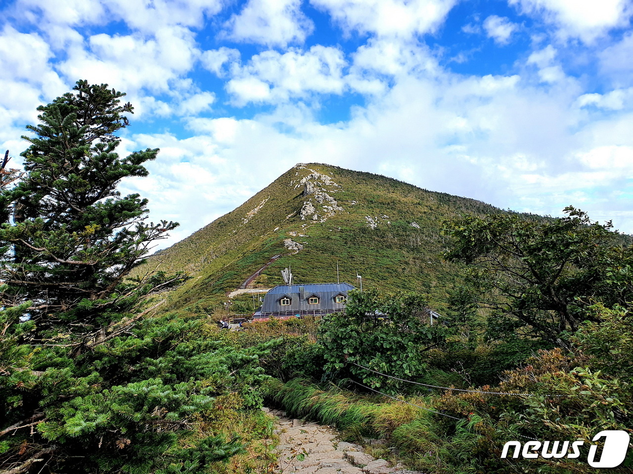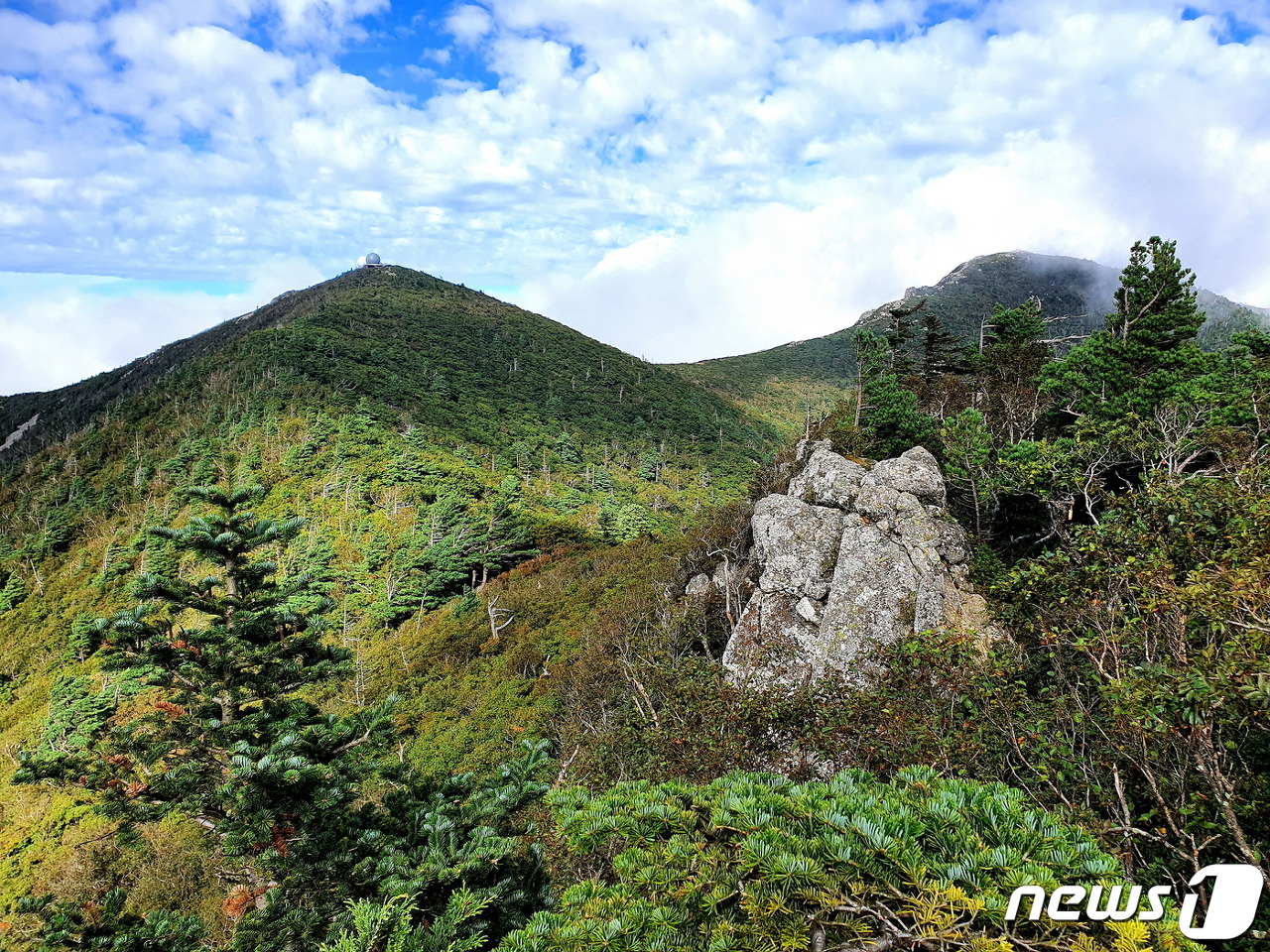 고산지대 식물인 분비나무가 수문장처럼 서있는, 중청대피소와 대청봉 풍경.