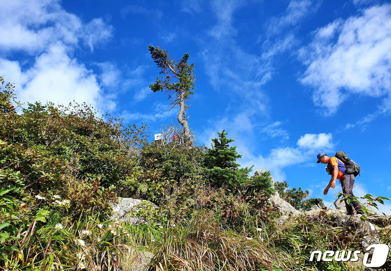 끝청봉. 뾰족한 정상에 분비나무 한 그루가 뾰족하다. 바위 틈틈에 핀 구절초의 청초한 흰빛이 여긴 완연한 가을임을 알리고 있다.