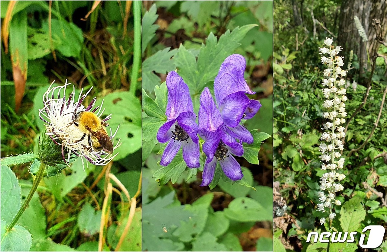 서북능선의 야생화들. 왼쪽 정영엉겅퀴의 꿀을 빨아먹고 있는 좀뒤영벌, 가운데 투구처럼 생긴 투구꽃, 오른쪽 촛대처럼 생긴 촛대승마.