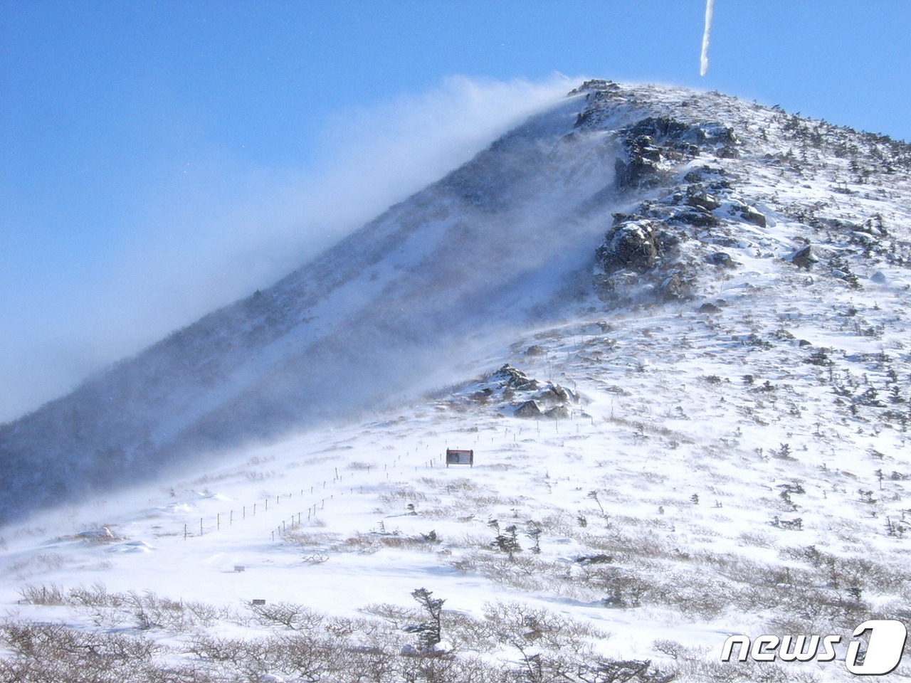 대청봉의 겨울. 눈보라가 일어 안개처럼 흩날리는 풍경