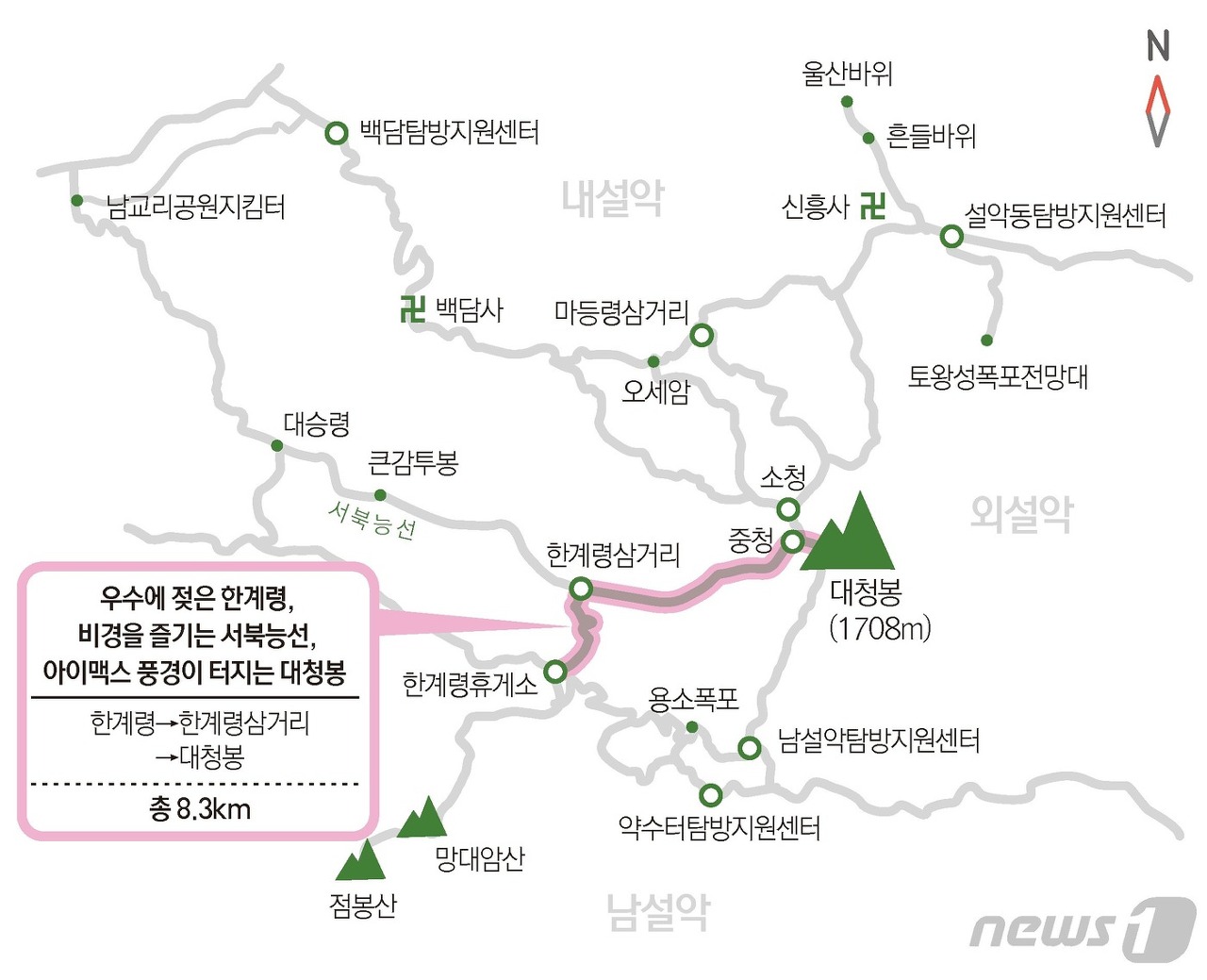 설악산의 20개 등산로 111㎞는 대부분 대청봉(1708m)을 향하고 있다. 대청봉에서 가장 가까운 등산로 기점은 오색(5㎞/3~4시간)이고, 가장 먼 곳은 서북능선-12선녀탕계곡를 거쳐 내려가는 남교리(22.2㎞/10~12시간)다. 가장 많은 사람이 다니는 코스는 오색-대청봉-천불동-설악동(16㎞/8~9시간)이다. 기자는 한계령에서 대청봉에 올라 천불동-설악동으로 내려서는 약 19㎞의 길을 간다. 중청대피소에서 하룻밤 자는 1박2일 코스다.