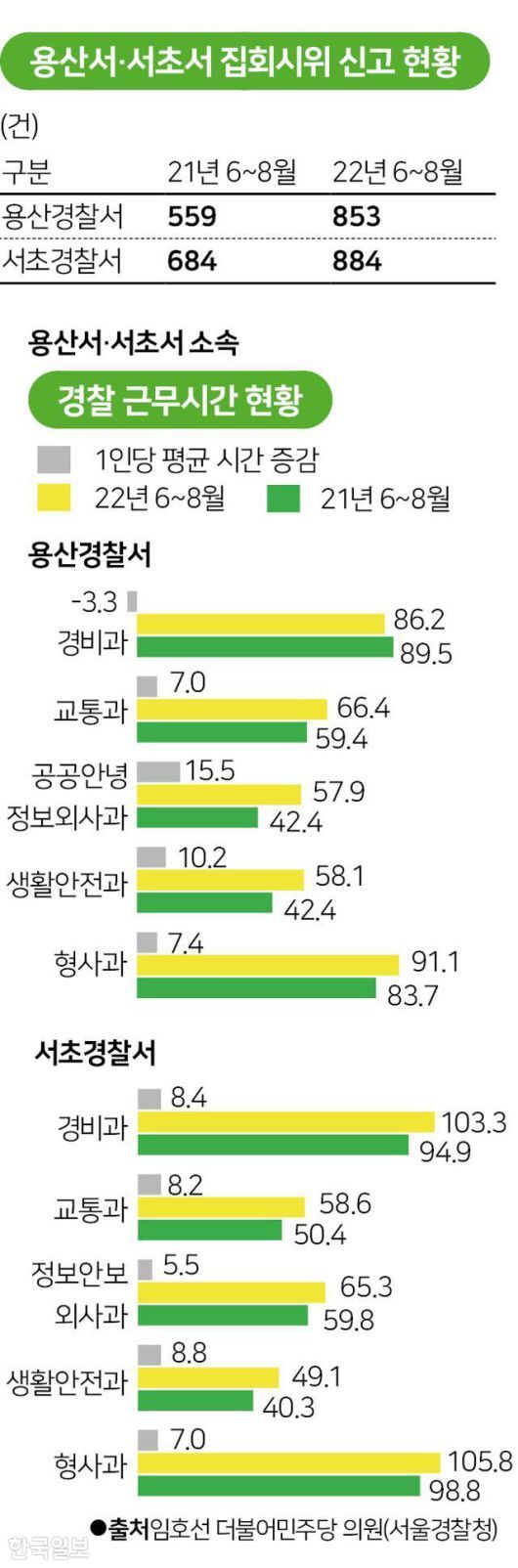 5일 임호선 더불어민주당 의원실이 경찰청으로부터 제출받은 자료에 따르면, 서울용산경찰서에서 집회ㆍ시위 현장을 관리하는 경비과 직원들은 6~8월 석 달간 총 6,123시간 초과근무를 했다. 직원 한 명당 월평균 초과근무 시간은 86시간으로 집계됐다. 한 달 근무일수를 22일로 가정할 때 매일 법정 근로시간(8시간)에 더해 4시간가량 더 일한 셈이다.