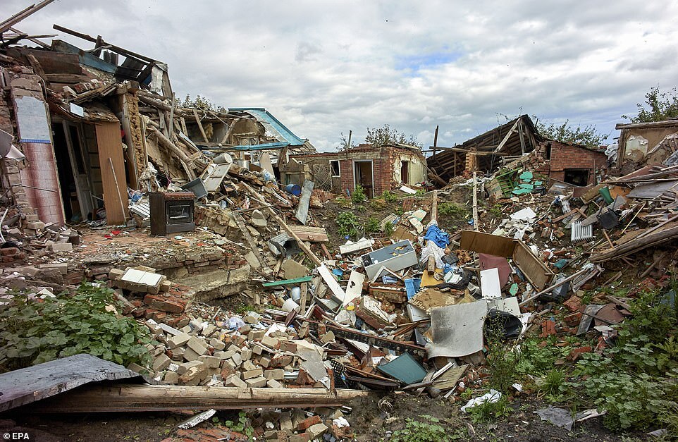 Private buildings damaged in shelling in Tsyrkuny village of Kharkiv area, as pictured on Wednesday