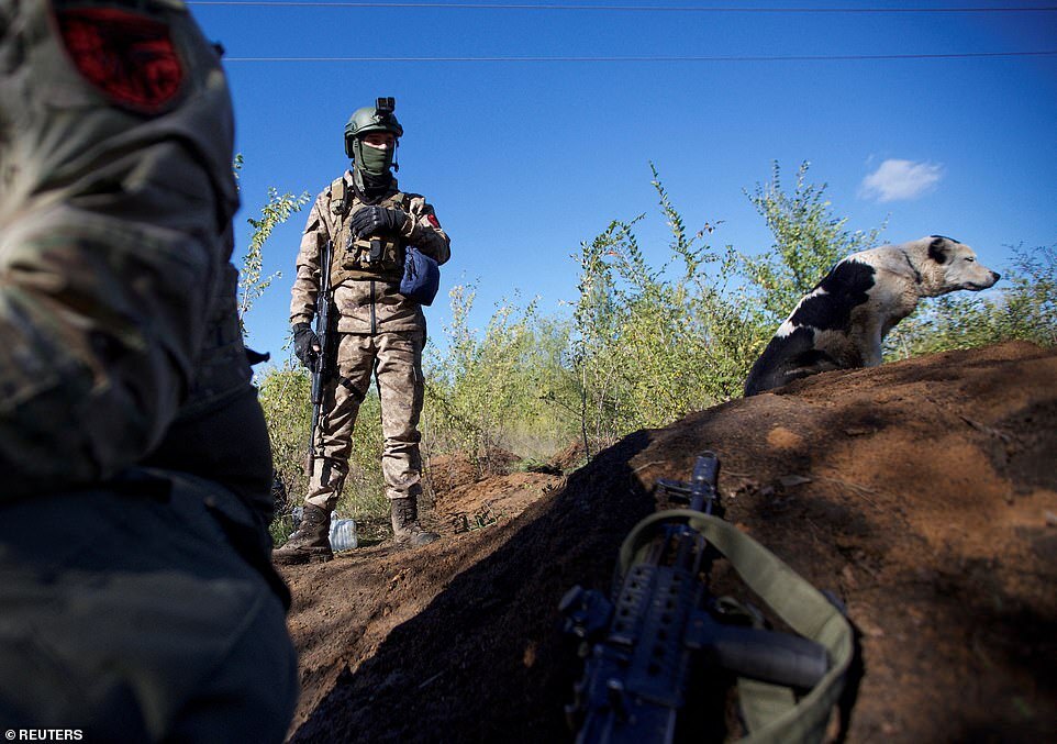 Ukrainian servicemen and a dog stand at a position on Wednesday, amid Russia's attack on Ukraine, outside the town of Bakhmut, in Donetsk Region, Ukraine