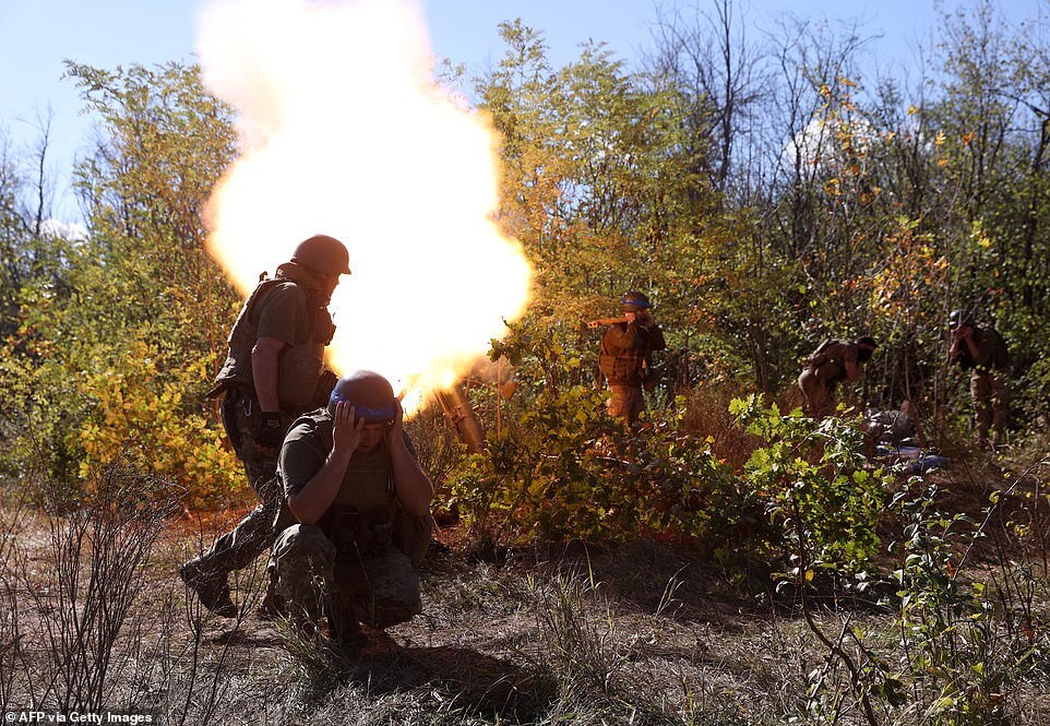 Ukrainian servicemen fire a mortar from their position on the front line with Russian troops in the Donetsk region earlier today
