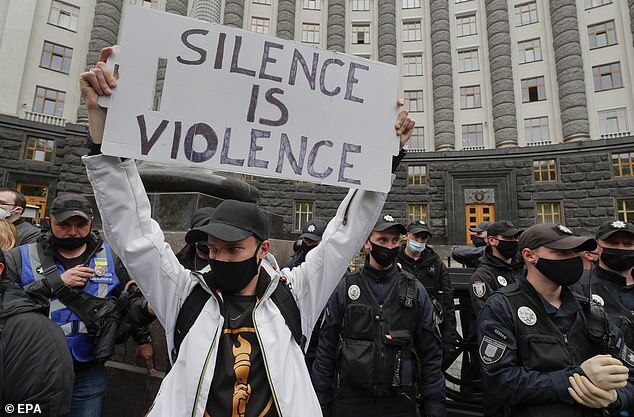 A protester within a group of Center for Civil Liberties activists and LGBT Community representatives, stands before a police line during their rally in front of the Cabinet of Ministers building in Kiev, Ukraine, June 5, 2020
