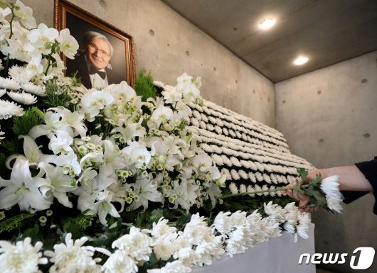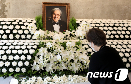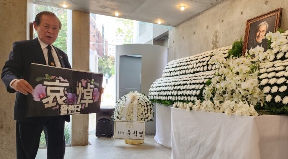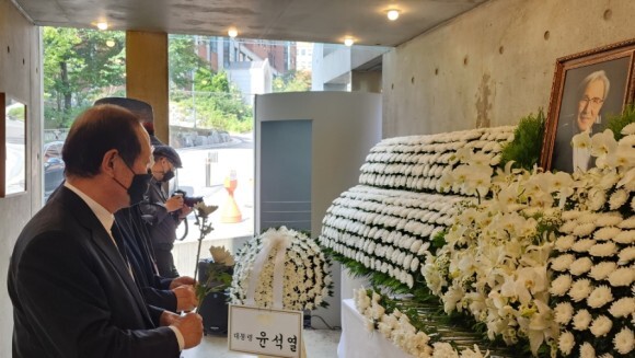 빈소에는 수백개 근조화가 즐비한 명망가 상가와 전혀 달리 윤석열 대통령이 보낸 근조 화환 1점만 보인다.