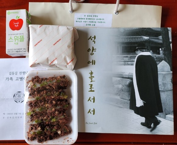 유족측은 조문객들에 김 교수 활동 사진 책자(석양에 홀로 서서),떡,샌드 위치,음료 등이 담긴 고별 선물 꾸러미를 챙겨주었다.
