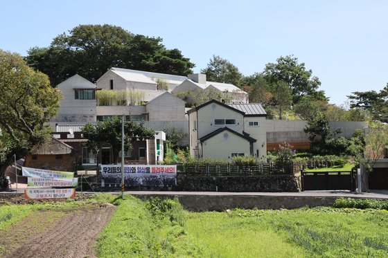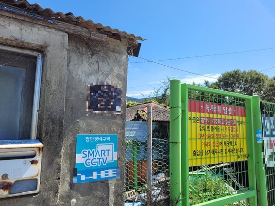 지난달 23일 경남 거제시 거제면 남정마을에 있는 문재인 전 대통령 생가에 ″조용히″라고 적힌 검은색 가림막이 설치돼 있다. 안대훈 기자