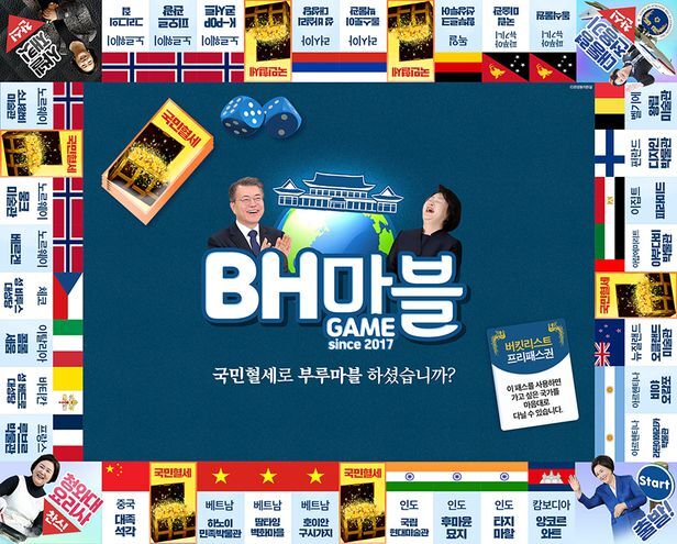 이와 함께 권 의원은 보드게임 부루마블의 게임판을 패러디한 “BH마블” 게임판 사진을 공개했다. 부루마블 게임은 세계 여러 나라의 명소를 여행하는 것을 콘셉트로 한 게임이다. 권 의원이 공개한 BH마블 게임판에는 캄보디아, 인도, 베트남, 노르웨이, 러시아, 독일, 이집트 등 김정숙 여사가 순방한 나라들의 명소가 적혀있다.