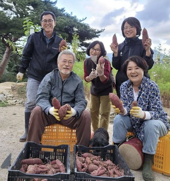 사진 속 문 전 대통령은 김 여사, 비서진과 함께 고구마, 호박 등을 들고 환하게 웃고 있는 모습이다. 그러면서 “수확의 기쁨”이라는 문구와 함께 ‘#밭일에진심’이라는 해시태그도 붙였다.