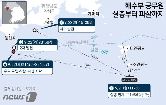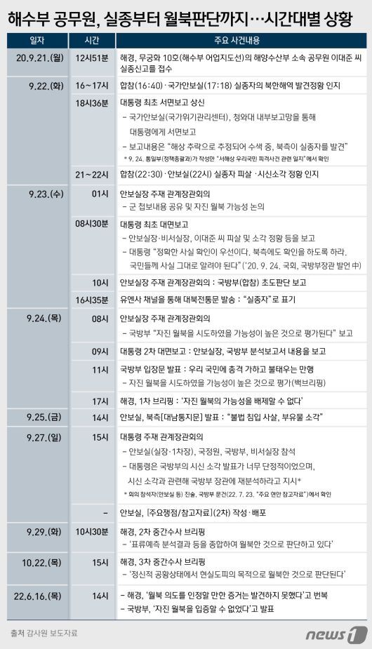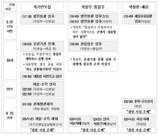 9월22일 17시 이전 발견정황 인지, 18시36분경 대통령 서면보고를 내부보고망을 통해 상신하였으나 이후 관계부처의 초동대처가 제때 이루어지지 않았고 이대준 씨는 21시40분경 피살된 후 소각.