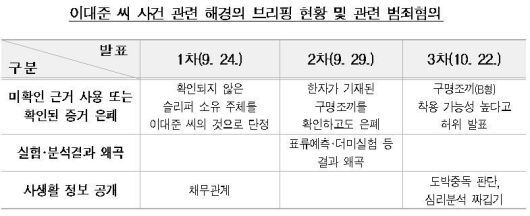 해경은 이대준 씨의 자진 월북 여부 등에 대한 수사를 실시하면서 3차례의 중간발표를 통해 수사 진행상황 및 결론("자진 월북") 등을 공개. 그 과정에서 확인되지 않은 증거를 사용하거나 기존증거 은폐, 실험 결과 왜곡, 사건과 직접 관련 없는 사생활 공개 등 사실과 다르게 수사결과 발표.
