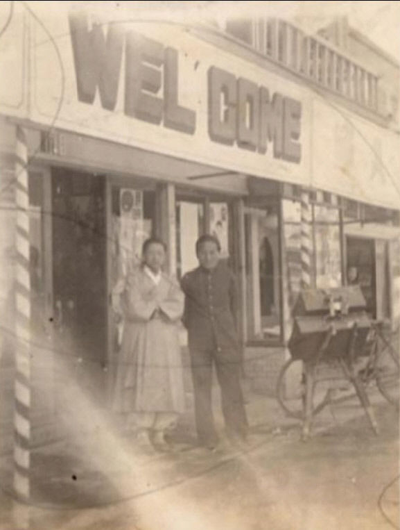 대구 무영당 앞에서 포즈를 취한 무영당 창립자 이근무(왼쪽)와 윤복진. <대구문학관 제공>