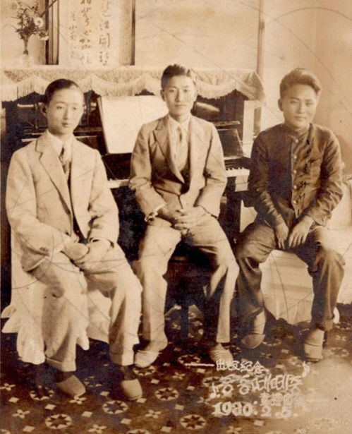 1930년 '중중 때때중' 출판을 기념해 무영당에서 무영당 창립자 이근무(왼쪽부터), 작곡가 박태준과 기념촬영을 한 윤복진. <대구문학관 제공>