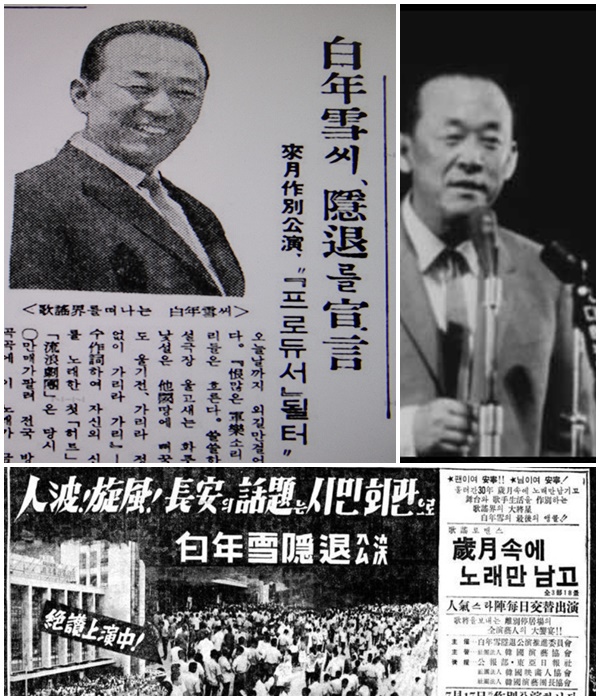 백년설 심연옥 부부는 서울로 환도한 이후 서울의 종로구 도염동에서 살았습니다. 1963년 여름, 백년설 선생은 30년 가수생활을 정리하는 은퇴공연을 성대하게 열었습니다. 선생의 노래를 아끼고 성품을 흠모하는 많은 동료 후배 대중연예인들이 출연료를 받지 아니하고 자발적으로 교체 참여하여 무대공연은 그야말로 대성황을 이루었습니다. 공연이 계속되던 여러 날 동안 매일 다른 출연진이 무대에 올라서 극장 앞은 인산인해를 이루었습니다.