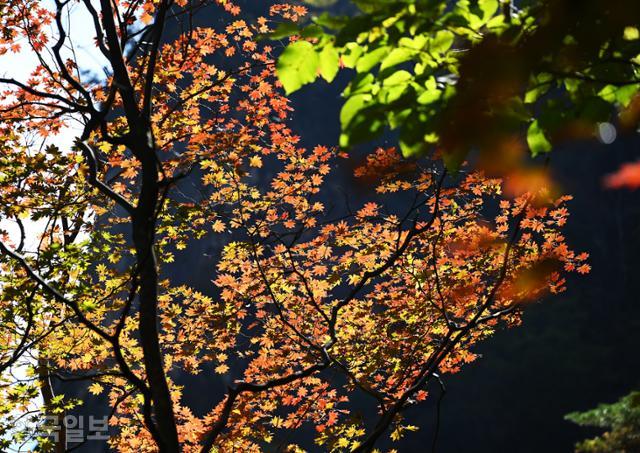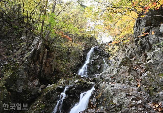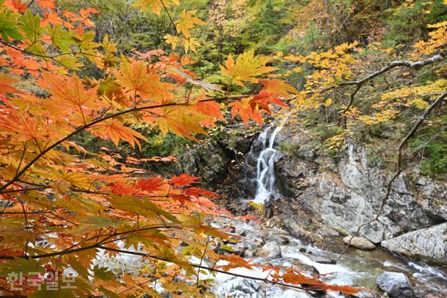 14일 미천골 상직폭포 앞에 단풍이 곱게 물들었다. 계곡을 걷는 내내 시원한 물소리가 끊이지 않는다.