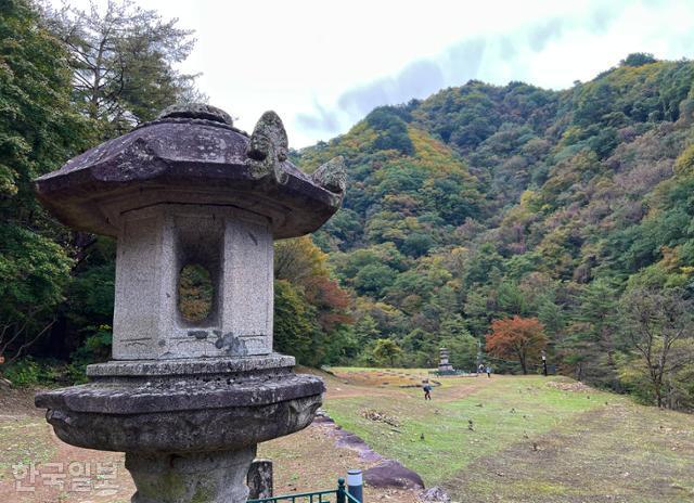 미천골 하류 선림원지의 삼층석탑. 뒤편 단풍은 이번 주부터 다음 주까지 절정에 달할 전망이다. 사진은 지난 14일 풍경이다.