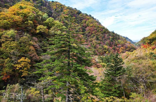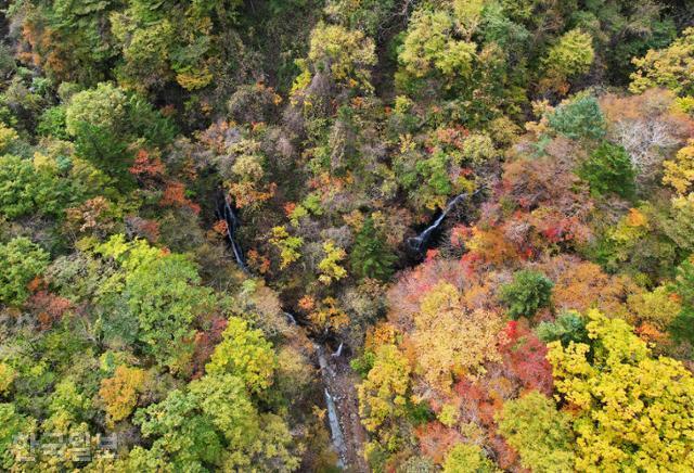 휴양림 산책로가 끝나는 곳에 상직폭포가 있다. 높이가 무려 70m에 이른다는데, 하부 10m가량을 제외하면 울창한 숲에 가려 제대로 보이지 않는다. 대신 물줄기 주변 단풍이 유난히 곱다. 휴양림 탐방객은 대개 이곳에서 발길을 돌리는데, 일부는 약 5km 상류의 불바라기 약수터까지 목표로 잡는다. 산림관리도로여서 걷기에 순탄하고, 완만한 오르막이지만 전혀 힘들게 느껴지지 않는다. 계곡 주변 단풍이 상류로 올라가면서 점점 짙고 화려해지기 때문이다. 눈길 닿는 곳마다 만산홍엽이다.