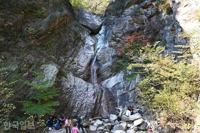 흘림골 등선대 아래 등선폭포 부근에서 탐방객들이 간식을 먹으며 쉬고 있다.