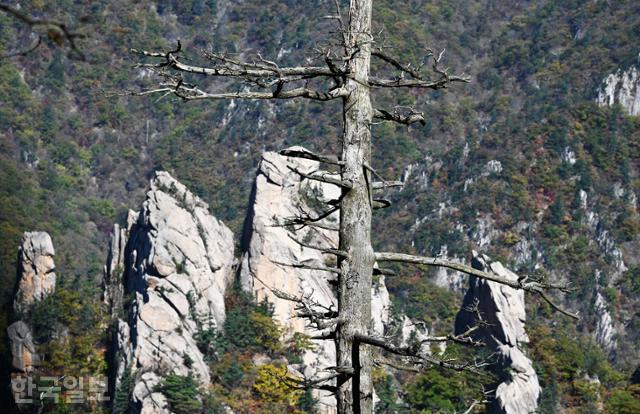 흘림골 탐방로의 여심폭포 부근. 높이 솟은 고사목 뒤로 칠형제봉의 기암괴석이 보인다.