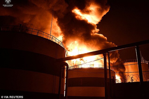 Further drone attacks on energy supplies left parts of the capital without electricity for several hours yesterday. At least three residents were killed. A storage facility is seen after it was hit by a Russian drone near Mykolaiv