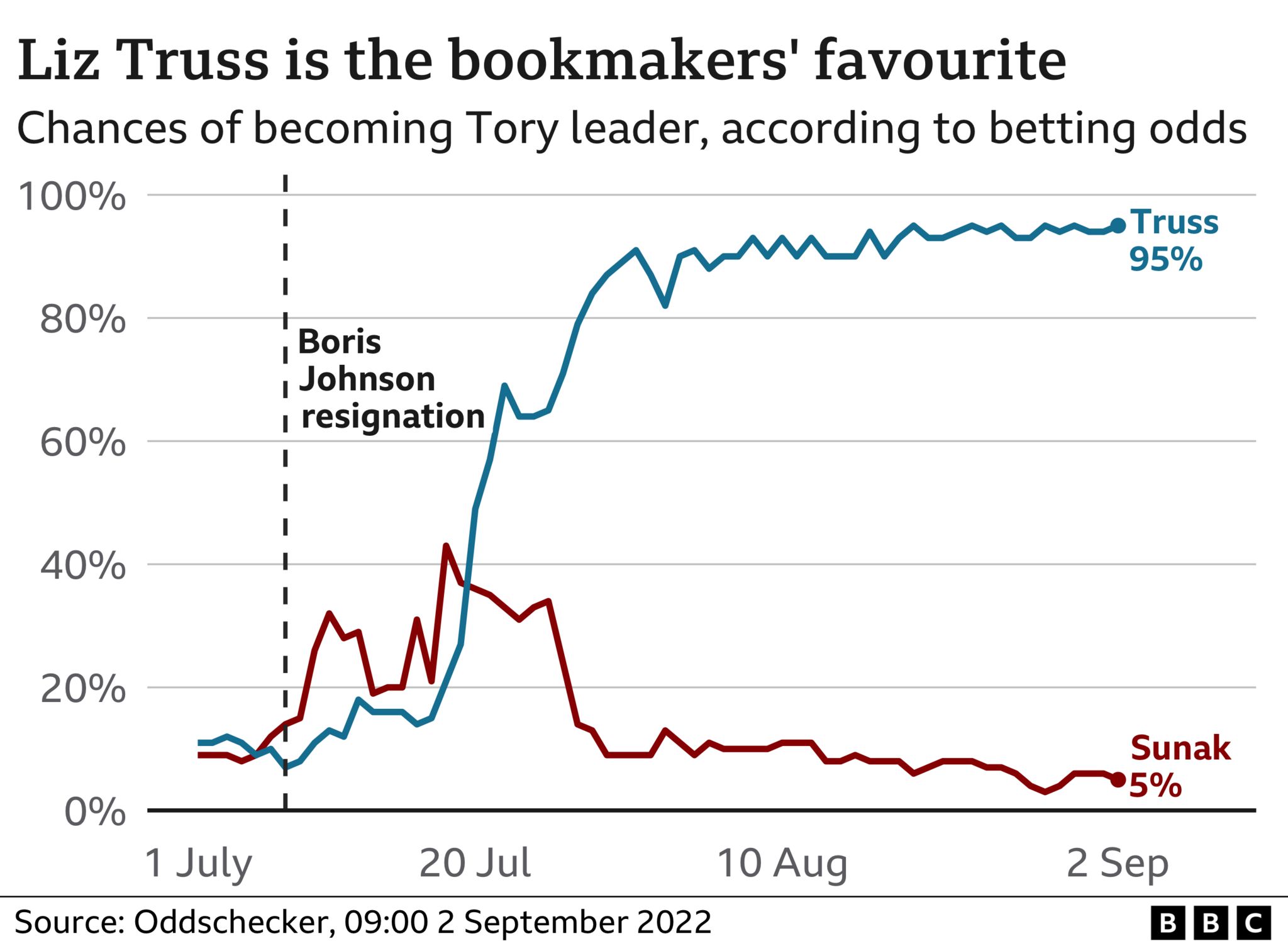 Foreign Secretary Ms Truss is the pollsters' favourite to win the Tory leadership race ahead of Rishi Sunak, with the winner announced on Monday.