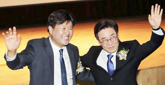 2019년 12월 성남 분당에서 열린 김용의 북콘서트에 참석한 이재명 지사가 김용 전 경기도 대변인과 함께 손을 잡고 사진을 찍었다. 이 사진은 김씨가 2019년 12월 15일 올린 김씨의 블로그 게시물에서 캡쳐했다. [김용 블로그 캡쳐]