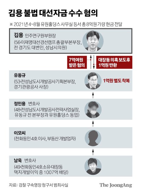 남욱 변호사 지시로 현금 8억4700만원가량을 마련한 천화동인 4호 임원이자 부동산 개발업자 이모씨가 정민용 전 성남도시개발공사 전략사업실장에게 건네고, 이를 다시 유 전 본부장이 받아 김 부원장에게 전달하는 과정에서 유 전 본부장이 1억원의 '배달 사고'를 냈다고 한다. 김 부원장도 지난해 9월 대장동 비리 의혹이 언론을 통해 불거지자 자신이 받은 7억여원 가운데 1억원을 유 전 본부장에게 돌려줬다고 한다. 김 부원장이 실질적으로는 6억여원을 챙긴 셈이다.