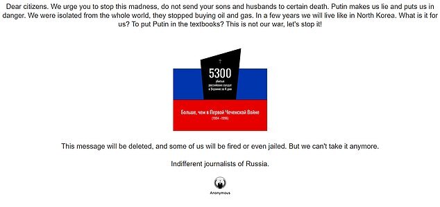 Hackers declare CYBERWAR on Russia: Anonymous collective take down THREE Russian news agency websites after attacking Kremlin-backed channel RT By KATE DENNETT FOR MAILONLINE PUBLISHED: 22:44 AEDT, 28 February 2022 | UPDATED: 22:51 AEDT, 28 February 2022 Anonymous collective have taken down three Russian news agency websites after attacking Kremlin-backed channel RT. The elusive computer experts..
