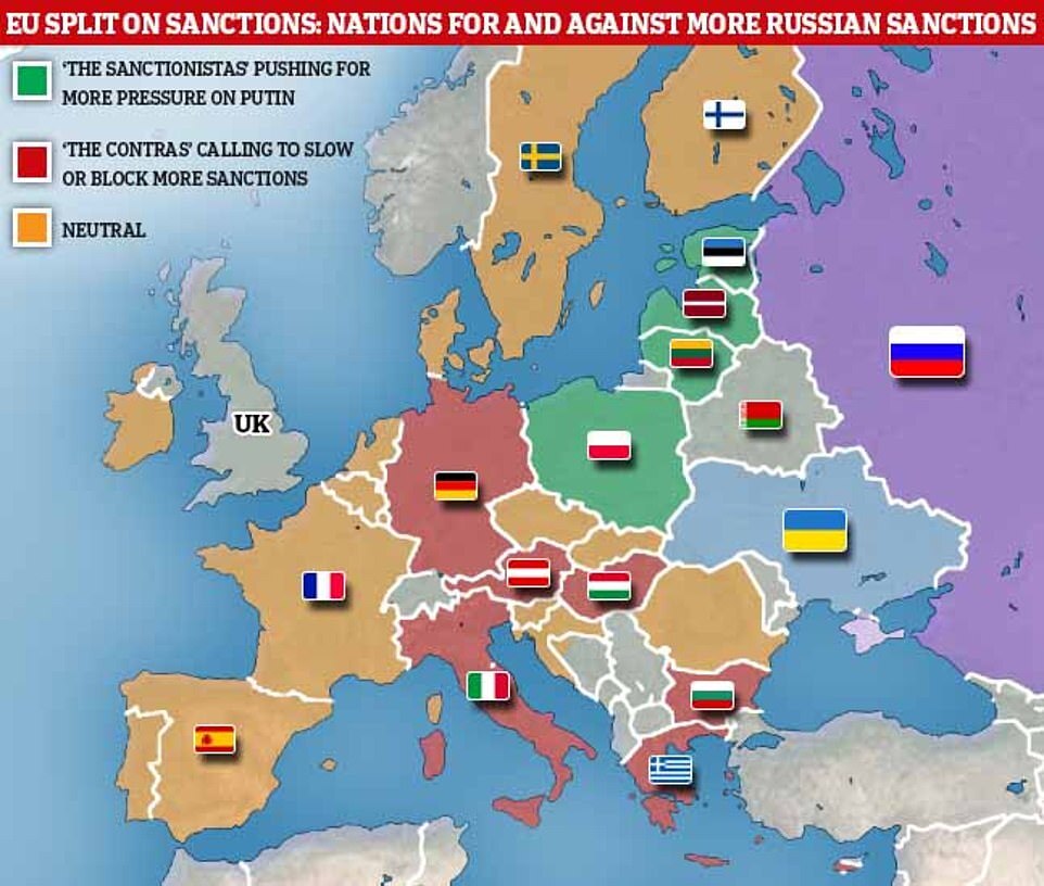 EU at war over Russian sanctions: Germany and Italy are among nations trying to block more restrictions to protect their own economies despite pressure from Poland and Baltic states that are right on Putin's doorstep Germany and Italy among countries in the EU understood to be 'prioritising own economies' over sanctions It comes as countries on border with Ukraine and Russia, including Poland, a..