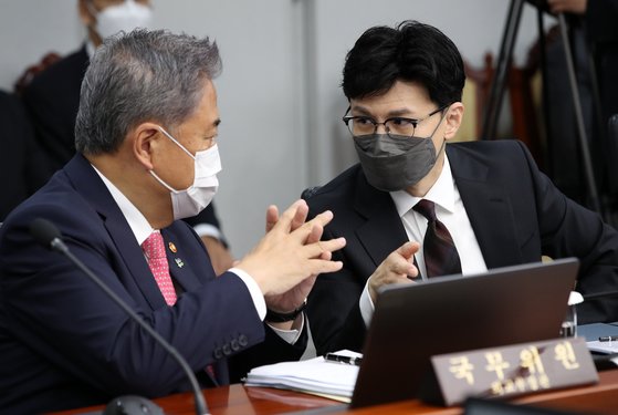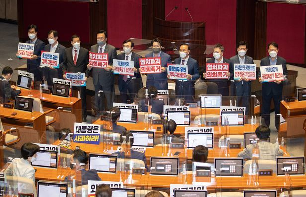 ‘박진 해임건의안’ 국회 본회의 통과… 與 불참, 野 단독처리 조선비즈 = 박지영 기자 조선비즈 = 민영빈 기자 입력 2022.09.29 19:10 국민의힘 정진석 비상대책위원장과 의원들이 29일 오후 국회에서 본회의에서 박진 외교부 장관 해임건의안 상정을 반대하며 피켓 시위를 하고 있다. /국회사진기자단 박진 외교부 장관에 대한 해임건의안이 29일 국회 본회의를 통과했다. 국민의힘 의원들이 불참을 선언하며 본회의장을 퇴장한 가운데 더불어민주당이 단독으로 처리했다. 김진표 국회의장은 이날 오후 6시 속개된 국회 본회의에 박 장관 해임건의안을 상정했다. 표결 결과 투표수는 170매, 찬성 168표, 반대 1표, 기권 1표로 나타났다. 여당인 국민의힘 의원들은 박 장관의 해임 건의안이 상정되자 일제히 퇴장했..